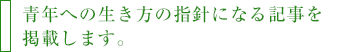 毎号、学校で職場で、知りたい、聞きたい、学びたいテーマで特集を組み、同世代の青年へのインタビューやルポ記事をはじめ、先輩からのアドバイスコーナーや参考図書を紹介するなど、多方面から生長の家の教えを生活に活かす方法を伝授します。